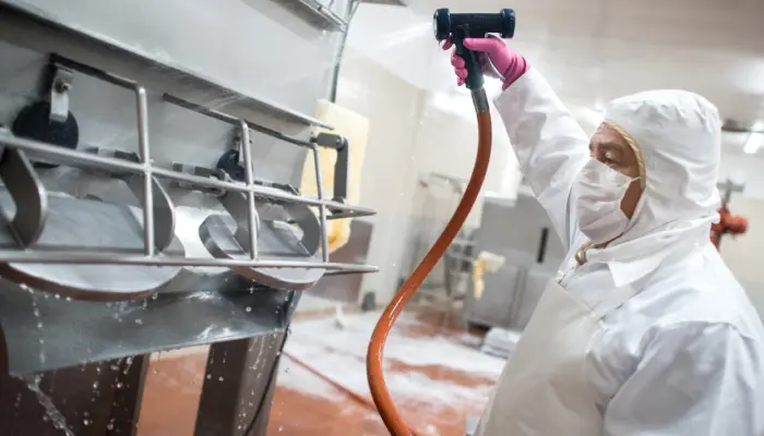 - Asegura ambientes higiénicos en superficies de contacto: es capaz de eliminar de forma rápida y efectiva una amplia variedad de microorganismos presentes en superficies que tienen contacto directo o indirecto con los alimentos, como mesas, bandas transportadoras, utensilios, envases y herramientas. Su uso previene la proliferación de bacterias como Salmonella, Listeria y E. coli, responsables de brotes graves de enfermedades.